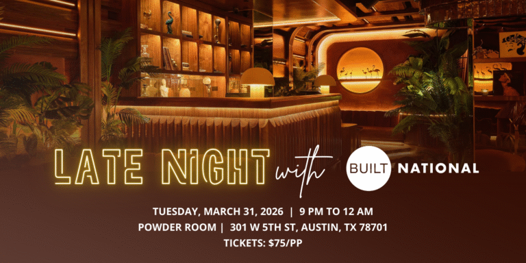 Join us on Tuesday, March 31, 2025, from 9 pm – 12 am at Powder Room (301 W 5th St, Austin, TX 78701) for a late-night event with BUILT National!